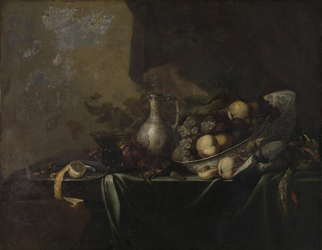 Keywords: Stilleven met vruchten Rijksmuseum SK-A-2083.jpeg accession number SK-A-2083 Michiel Simons II credit line nl Stilleven met vruchten Op een tafel liggen uitgestald een bord met een geschilde citroen een roemer met wijn druiven een porceleinen kannetje en een schaal van Chinees porcelein met druiven perziken pruimen en hazelnoten Rechts liggen enkele dode vogels drager Height cm 89 drager Width cm 113 5 exhibition history Institution Rijksmuseum Technique oil canvas object history Acquisition 1903 object type Potential derivatives exist check http //commons wikimedia org/w/index php search Rijksmuseum+SK-A-2083 this search PD-US PD-old Data and photography rights All data and all images made available through the API are either in the public domain or are subject to a CC0 license https //www rijksmuseum nl/en/api/terms-and-conditions-of-use cc-zero place of creation http //www rijksmuseum nl/collectie/SK-A-2083 Stilleven met vruchten Q17327300 Uploaded with GWToolset Stilleven met vruchten Rijksmuseum SK-A-2083 http //www rijksmuseum nl/media/assets/SK-A-2083 Images uploaded by Fæ Images from the Rijksmuseum Dutch Golden Age paintings in the Rijksmuseum Amsterdam Michiel Simons
