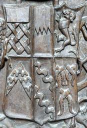 | Keywords: StLeger Escutcheon Monkleigh Devon.png FitzWarin feudal baron of Bampton Quarterly per fess indented argent and gules<ref>Pole p 482</ref> 3rd A lion rampant crowned possibly Turberville 4th Hankford of Annery for Richard II Hankford c 1397-1431 of Annery feudal baron of Bampton Sable a chevron barry undee argent and gules<ref>Pole p 486</ref> 5th Stapledon for Stapledon of Annery Argent two bends undee sable<ref>Pole p 502</ref> as visible on monument of Walter Stapledon Bishop of Exeter in Exeter Cathedral 6th Argent three barnacles gules tied sable Donet of Sileham Rainham Kent<ref>As seen on the Garter stall plate of Sir Anthony St Leger d 1559 KG Sir John St Leger d 1442 of Ulcombe Kent married Margery Donet or Donnet daughter and heiress of James Donet d 1409 of Sileham Rainham Kenthttp //www british-history ac uk/report aspx compid 62942</ref> own photo Lobsterthermidor <span class signature-talk ></span> 22 48 15 August 2014 UTC century 16 Monkleigh church St Leger arms FitzWarin arms Hankford arms Stapledon arms Donet arms |