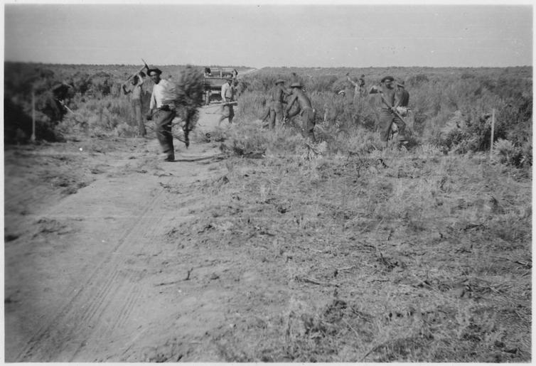 | Keywords: Stock Driveway. Clearing and widening the Stock Driveway - NARA - 298351.tif Scope and content Camp DG 4 is located one mile southwest of Springfield Idaho in the SE 1/4 Section 14 Township 4 South Range 32 East It is occupied by CCC Company 990 from Big Sur State Park 12 Monterey District California The work area of this camp lies in Grazing District No 3 It is located about one mile from the rail head Construction of the Camp was begun by the advanced detail on May 1 It was occupied by the main body May 15 Field work was begun May 30 General notes 298351 Local identifier Department of the Interior Bureau of Land Management Idaho State Office Burley District Office 07/16/1946 NARA's Pacific Alaska Region Seattle NRIAS 6125 Sand Point Way NE Seattle WA 98115-7999 other date ~ 1935 Record group Record Group 49 Records of the Bureau of Land Management 1685 - 2006 Record group ARC 378 Range Improvement Soil and Moisture Conservation Project Files compiled ca 1935 - ca 1947 Series ARC 298326 File unit CCC Camp DG-4 Springfield Idaho ca 1925 - ca 1930 File unit ARC 298327 Variant control numbers NAIL Control Number NRIS-49-BURLEYRANGEIMP-DG4SPRING-14B yes Other versions <gallery> File Stock_Driveway _Clearing_and_widening_the_Stock_Driveway_-_NARA_-_298351 tif tif File Stock_Driveway _Clearing_and_widening_the_Stock_Driveway_-_NARA_-_298351 jpg jpg </gallery> NARA-cooperation PD-USGov NARA TIF images with categorized JPGs |