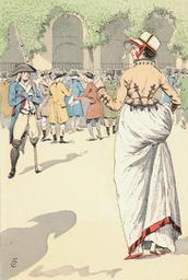 Keywords: Stock-jobbing in the Palais-Royal, Year VII - 1799.jpg Artwork says they are stock-jobbing or buying and selling speculative stocks with little regard for the value of the capital of the company simply to make a fast and easy profit This practice was popularized in the 18th century by the English bourgeois The woman wears a fitted coat resembling a man's English hunting coat At this period London was increasingly the center of men's fashion as manifested by its influence on the still-dominant Parisian women's fashion This women's dress is somewhat frillier and wider than the neo-classical 'chemise ' as women's dresses became more ornate as the 19th century progressed 1898 colored plate 10 x 15 cm Institution Brown University Library object history exhibition history credit line Published in Octave Uzanne Fashion in Paris the various phases of feminine taste and aesthetics from 1797 to 1897 London William Heinemann 1898 accession number 1145808167774118 PD-old Les modes de Paris 008 Images of Paris from the Brown University Library 1799 in Paris 18th-century people of Paris Fashion in 1799 Historical images of Palais Royal Females with white dresses in art 1790s dresses Fashion plates depicting men |