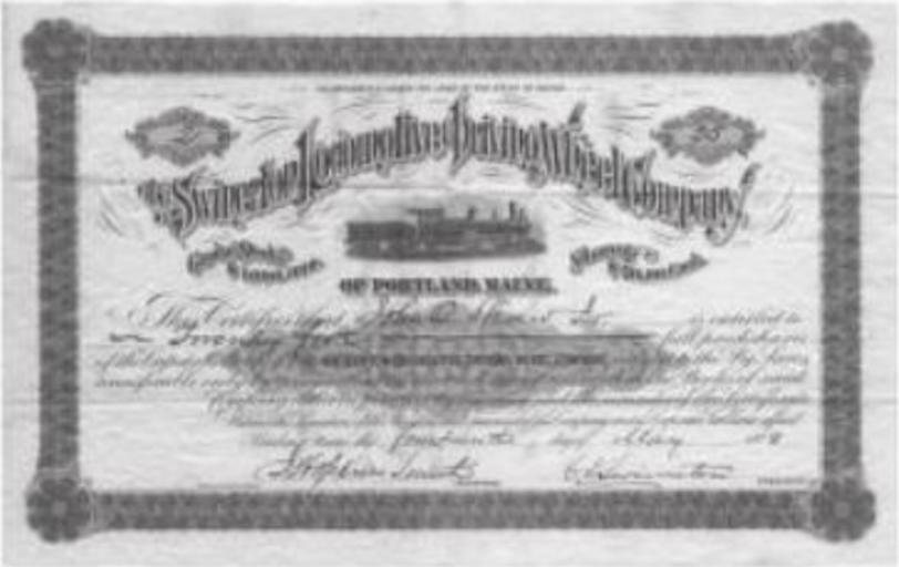 | Keywords: Stock of Swinerton Locomotive Driving Wheel Company (1888).png en Stock of Swinerton Locomotive Driving Wheel Company 1888 Odd capital stock printing date shows 188_ but most likely published in 1888 20 share of 1 000 000 capital A steam lokomotive probably 'Onward' is shown below fancy letters 15 inch wide 2015-06-28 cite book Terry Cox Collectible Stocks and Bonds from North American Railroads Guide with Prices http //books google com/books id mETl1i5rNcEC pg PA490 1 January 2003 Terry Cox 978-0-9746485-0-7 490 Collection of John M Szabol Published by Terry Cox other versions PD-old-70-1923 Uploaded with UploadWizard Swinerton Stock certificates from the United States |