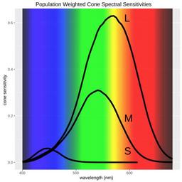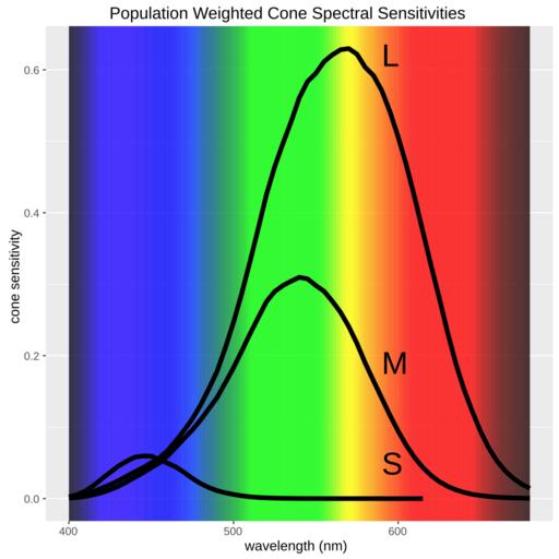 Keywords: Stockmansharpe10degCMFadj2000 popconsens.svg en Population weighted L 63 M 31 S 6 cone spectral sensitivities from Stockman and Sharpe using 'colorscience' package for R Source code library ggplot2 library tidyr library colorscience library ggspectra o df<-StockmanSharpe10degCMFS2000 colnames o df c wavelength L M S o df lms<-c L M S lin df<-o df lin df lin df L<-lin df L 0 63 lin df M<-lin df M 0 31 lin df S<-lin df S 0 06 t df <- lin df > gather cone type response L S t df response ggplot t df aes x wavelength y response group cone type + stat_wl_strip alpha 0 4 ymin -Inf ymax Inf + scale_fill_identity +geom_line color black size 2 +geom_text data t dft df wavelength 590 aes label cone type size 8 hjust 0 vjust -1 +labs title Population Weighted Cone Spectral Sensitivities x wavelength nm y cone sensitivity +xlim 400 680 + theme text element_text size 10 ggsave stockmansharpe10degCMFadj2000_popconsens svg cc-zero Color vision |