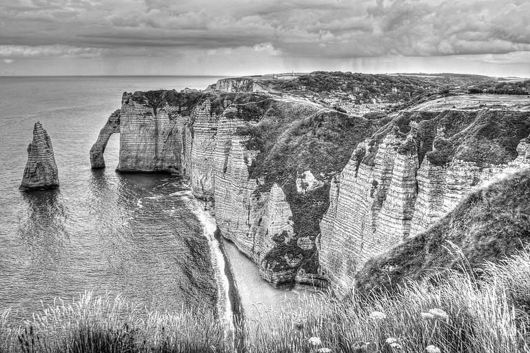 Keywords: stone arch cliff etretat black white landscape normandy sea erosion limestone nature france roche ocean creuse water beach maneporte tourist tourism picturesque mecca