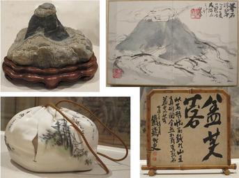 | Keywords: Stone, bag, album & screen by Tomioka Tessai, Tanaka Hakuin, Tajika Chikuson & Hashimoto Kansetsu, Honolulu Museum of Art.jpg en Set of stone in shape of Mount Fuji painted storage bag album of three paintings of Mount Fuji and miniature table screen by Tomioka Tessai 1836-1924 Tanaka Hakuin 1865 - 1934 Tajika Chikuson 1864 - 1922 and Hashimoto Kansetsu 1883 - 1945 Japan Meji period 1911 Honolulu Museum of Art accession 12289 1-4 own Hiart photo 2014 Photo Cc-zero Objects PD-Japan Japanese calligraphy in the Honolulu Museum of Art Art of Japan in the Honolulu Museum of Art Japanese paintings in the Honolulu Museum of Art Tomioka Tessai Tajika Chikuson Tanaka Hakuin Gassaku Hashimoto Kansetsu |