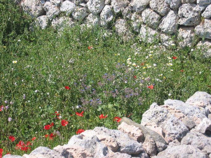 Keywords: stone wall wall stones poppy meadow wildflowers southern europe