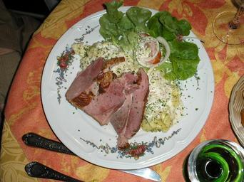 Keywords: Stra-ham+salad.JPG en Alsatian ham and potato salad La Vigne Winstub Strasbourg France own Joel Bradshaw 2008-01-02 Cc-zero Cuisine of Alsace Potato salads in France Restaurants in Strasbourg