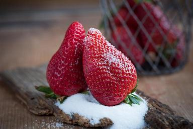 Keywords: strawberries red frisch ripe pair two two piece natural product eat nutrition food bless you sweet soft fruit fruit vitamins minerals vital substances healthy close food-photography sugar granulated sugar white