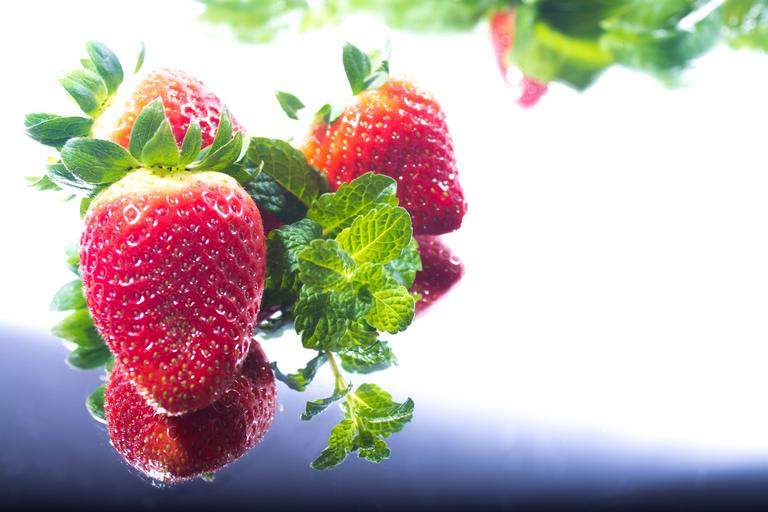 Keywords: strawberry fruit fruity red green food fruits delicious sweet healthy vitamins ripe summer strawberry fruit berries nature eat mirror mirror image contrast light shadow