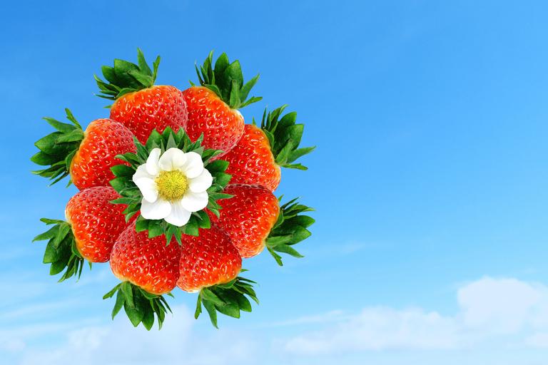 Keywords: strawberry strawberries pinwheel plant sky blue floating digital art photo montage mixup mashup ripe tasty eat garden fruit berry horizontal landscape free image royalty tree