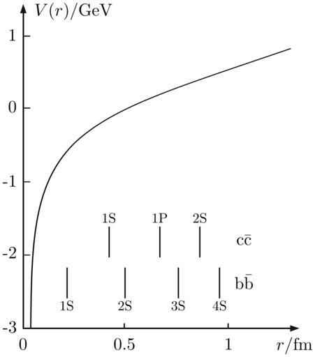 | Keywords: Strong Interaction Potential.svg en Potential V r of strong interaction as a function of distance r between two quarks which can be approximated by <math> V r -\frac 4 3 \frac \alpha r \hbar c r +kr </math> The vertical lines indicate rms radii of different quark-antiquark wave functions Reference Gottfried Weisskopf - Concepts of Particle Physics Vol 1 Oxford University Press 1984 ISBN 9780195043730 2012-07-29 own Franzl aus tirol cc-zero Quantum chromodynamics | ||||