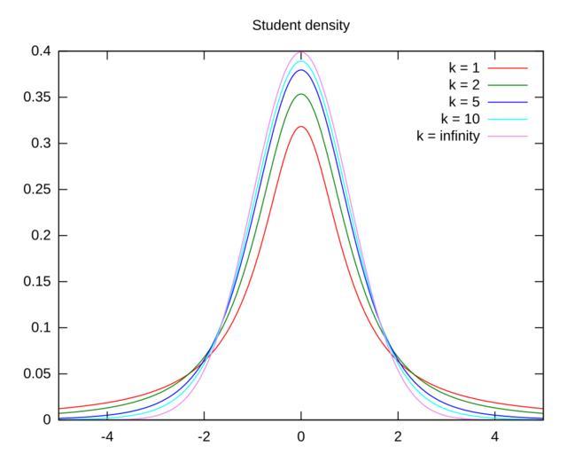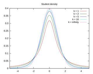 Keywords: Student density.svg en A plot of the Student's t-distribution where k is the number of degrees of freedom Plotted with gnuplot; to reproduce do <pre> set term svg set output student density svg set samples 500 set xrange -5 5 set title Student density f x t gamma t+1 /2 / sqrt t pi gamma t/2 1 + x 2/t - t+1 /2 plot f x 1 t k 1 f x 2 t k 2 f x 5 t k 5 f x 10 t k 10 exp -x 2/2 /sqrt 2 pi t k infinity lt rgb violet </pre> Created with Gnuplot fr Un graphe de la densité de probabilité de la loi de Student avec k le nombre de degrés de libertés Tracé avec gnuplot pour reproduire faire <pre> set term svg set output student density svg set samples 500 set xrange -5 5 set title Student density f x t gamma t+1 /2 / sqrt t pi gamma t/2 1 + x 2/t - t+1 /2 plot f x 1 t k 1 f x 2 t k 2 f x 5 t k 5 f x 10 t k 10 exp -x 2/2 /sqrt 2 pi t k infinity lt rgb violet </pre> Created with Gnuplot 2014-05-19 17 19 07 own Lugian cc-zero Uploaded with UploadWizard Check categories 2015 June 18 Student's t-distribution |