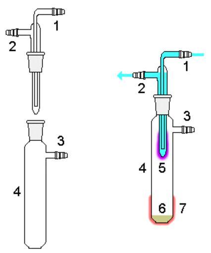 | Keywords: Sublimation apparatus.png 1 Cooling water in 2 Cooling water out 3 Vacuum/gas inlet 4 Sublimation chamber 5 Sublimed compound 6 Crude material 7 Heating Tradução 1 Água refrigerando dentro 2 Água refrigerando para fora 3 Entrada do vácuo/gás 4 Câmara do Sublimation 5 Composto Sublimed 6 Material cru 7 Heating Sublimation apparatus http //en wikipedia org/wiki/Sublimation_ chemistry 11 19 4 November 2006 Quantockgoblin Own work all rights released public domain Laboratory glassware sublimation Condensers chemistry laboratory equipment Laboratory distillation apparatus |