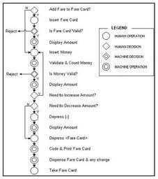 | Keywords: Subway Fare Card Machine Flow Process Chart.jpg en Subway Fare Card Machine Flow Process Chart Flow Process Charts - These charts are used to depict the sequence of operator activities or information transfer as part of a system A Flow Process Chart FPC is vertically oriented and can be annotated on either side with a time scale if the data is available These charts are developed to detail operator tasks and incorporate human and machine decision points http //www hf faa gov/webtraining/Usability/u19_tools3 htm faa gov webtraining FAA 2008 PD-USGov Flow process charts |
