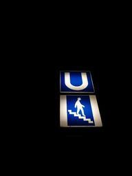 Keywords: subway station sign underground metro public transport subway stairway neon sign light night dark symbol pictogram city information