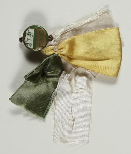 | Keywords: the women's library thewomenslibrary hires white background drawing indoor TWL.2004.603Badge, paper, plastic, metal, round, paper, produced by produced by Women's Freedom League, printed with a gold, green and white shield, left side of shield white with green printed inscription: 'Votes for Women', right side of shield gold with green printed inscription: 'WFL', paper covered with plastic, over metal base, clasp attached to back of badge extending beyond the sides of the badge, three pieces of silk, plain weave ribbon stitched to the clasp, ribbon yellow, white and green. Reverse engraved '178174/9/05, 17817/4/9/09 ptent'  TWL.2004.603Badge, paper, plastic, metal, round, paper, produced by produced by Women's Freedom League, printed with a gold, green and white shield, left side of shield white with green printed inscription: 'Votes for Women', right side of shield gold with green printed inscription: 'WFL', paper covered with plastic, over metal base, clasp attached to back of badge extending beyond the sides of the badge, three pieces of silk, plain weave ribbon stitched to the clasp, ribbon yellow, white and green. Reverse engraved '178174/9/05, 17817/4/9/09 ptent' |
