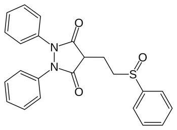 | Keywords: Sulfinpyrazone.svg Skeletal formula of sulfinpyrazone Created using http //www acdlabs com/download/chemsk html ACD/ChemSketch 8 0 and http //www inkscape org Inkscape Own 2007-05-25 Fvasconcellos 21 30 25 May 2007 UTC Phenyl compounds Pyrazolidindiones Sulfoxides Antigout agents |