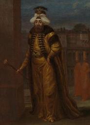 | Keywords: Sultan Mahmud I – Jean Baptiste Vanmour.jpg (cropped).jpg Artwork Creator Jean Baptiste Vanmour en 24th Sultan and 103rd Calip of Islam Mahmud I 1696 “1754 De sultan is geportretteerd in de open lucht vergezeld door twee dienaren Op de achtergrond zien we enkele gebouwen Mogelijk moet dit het haremgedeelte van het paleis van de sultan het Topkapı Sarayı voorstellen Ahmed III draagt een met bont gevoerde kaftan en een tulband die kâtibî wordt genoemd Dit type tulband was gedrapeerd rondom een plat hoofddeksel en versierd met een waaiervormig sieraad Ook de ceintuur van de sultan is rijk bezet met juwelen evenals de ceremoniële staf die hij in zijn rechterhand vasthoudt Staande ten voeten uit scepter in de rechterhand Op de achtergrond twee volgelingen voor het paleis ~ 1730 1737 oil canvas cm 33 5 26 5 Institution Rijksmuseum place of discovery object history exhibition history credit line accession number SK-A-2014 place of creation https //www rijksmuseum nl/en/search/objecten q Sultan p 1 ps 12 ii 3 /SK-A-2014 3 Rijksmuseum Sultan Mahmud I “ Jean Baptiste Vanmour jpg Custom license marker 2015 09 13 PD-old-100 Uploaded with UploadWizard Mahmud I Paintings by Jean Baptiste Vanmour Paintings by Jean Baptiste Vanmour with fur Turkish paintings in the Rijksmuseum Amsterdam Fur clothing of native people of Turkey Paintings of men of Turkey |