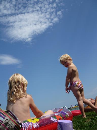 Keywords: summer beach swim girl children blond swimming trunks skin sand bucket grass