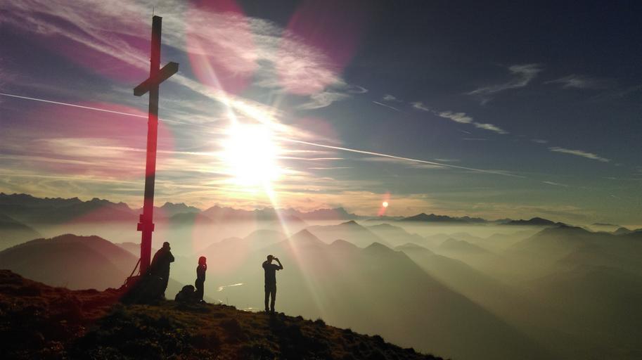 Keywords: summit mountains camaraderie sunset glow sunrise fog landscape natre mistery top of the mountain human silhouettes