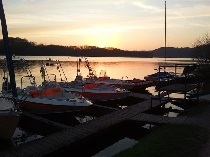 Keywords: sun lake sunset water sky sea evening landscape nature mirroring dusk clouds wave lifeboat dlrg boot web