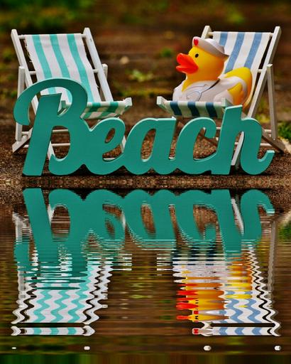 Keywords: sun loungers beach water bank mirroring font rubber duck summer sun relaxation relax holidays leisure recovery resort distant holiday deck chair sea
