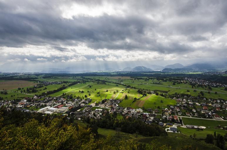 Keywords: sunbeams sky clouds landscape green grass fields trees mountains rural town village