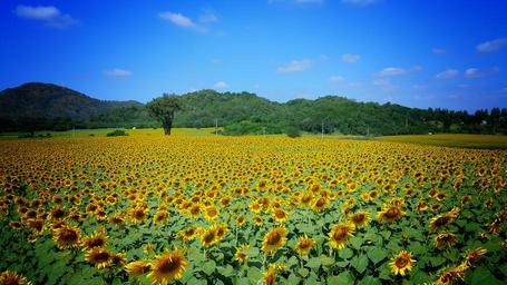 Keywords: sunflower field yellow blue sky bright