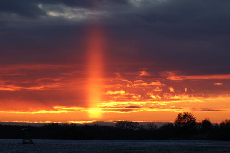 Keywords: sunpillar weather phenomenon evening sky sunbeam winter snow sunset abendstimmung landscape sky afterglow