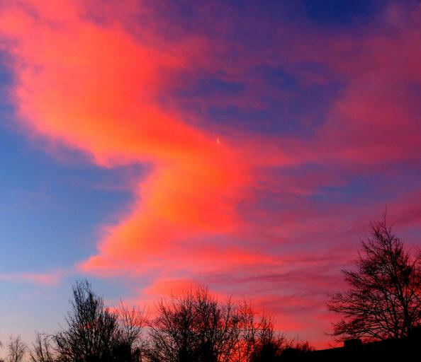 Keywords: sunrise morgenrot skies moon crescent trees