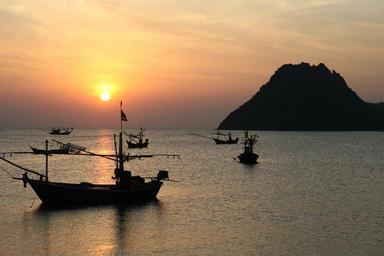 Keywords: sunrise peaceful serene harbor cove boat fishing boat water thailand dawn bay
