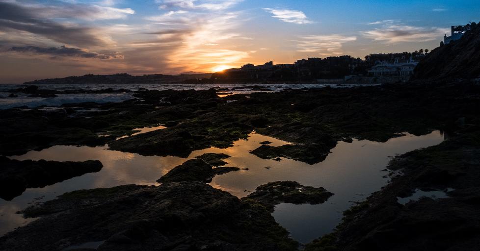 Keywords: sunset beach costa blue sky orange waves clouds mijas malaga andalusia spain highlights rays sun