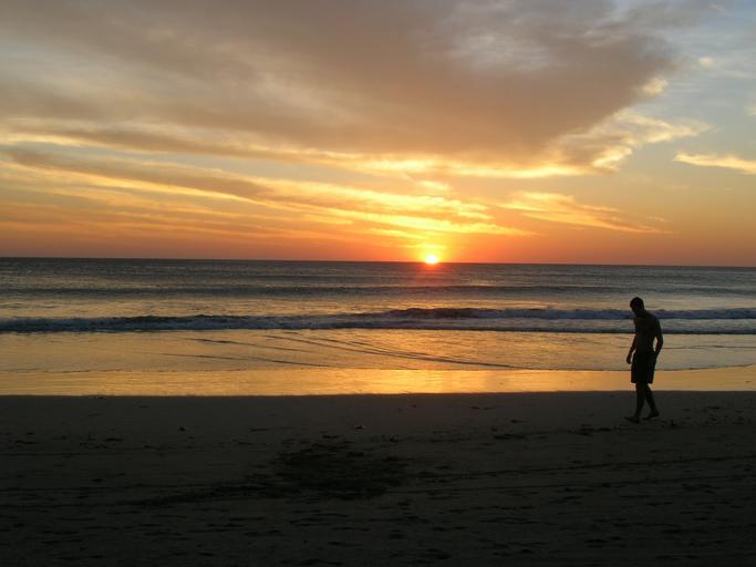 Keywords: sunset beach sand walking man male sky clouds sun colorful vibrant beautiful lovely peaceful calm serene solitary sea ocean