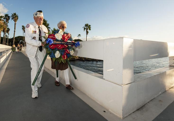 | Keywords: Sunset ceremony 131206-N-WX059-056.jpg en Delton Walling a survivor of the 1941 attack on Pearl Harbor is presented with a wreath during a sunset service at the USS Utah Memorial on Joint Base Pearl Harbor-Hickam At the time of the attack Walling was a petty officer and signalman attached to the battleship USS Pennsylvania BB 38 then dry-docked in port and was assigned to the communications force of Admiral Husband E Kimmell commander of the Pacific Fleet U S Navy photo by Mass Communication Specialist 2nd Class Sean Furey/Released 2013-12-06 Petty Officer 2nd Class Sean Furey https //www dvidshub net/image/1068833 131206-N-WX059-056 2013-12-09 22 08 PEARL HARBOR HI US PD-USGov-Military-Navy 72nd anniversary of Pearl Harbor attacks USS Utah Memorial Images from DoD uploaded by Fæ |