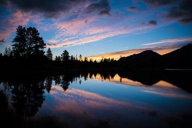 Keywords: sunset lake reflection glassy mirror surface smooth calm tranquil silhouettes trees water sky nature landscape sun summer evening colorful scenic dusk outdoor twilight peaceful idyllic