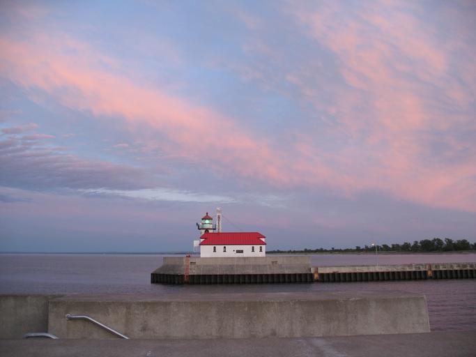 Keywords: sunset lighthouse sky coastline navigation maritime architecture beacon blue pink lake superior michigan