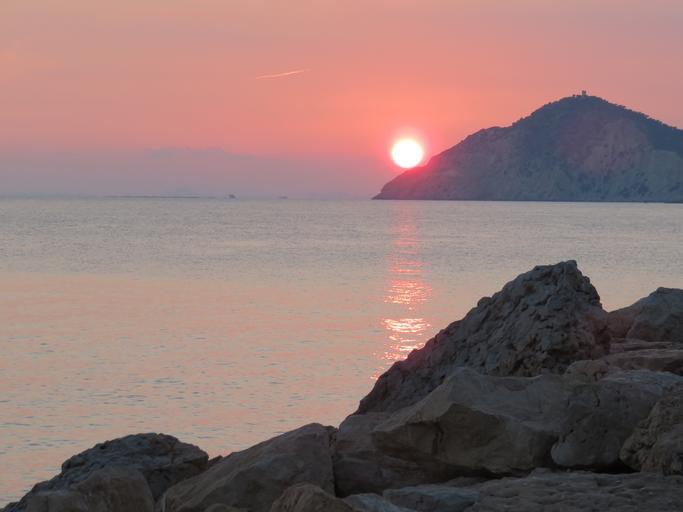 Keywords: sunset mediterranean sea mountains stones sky orange sun