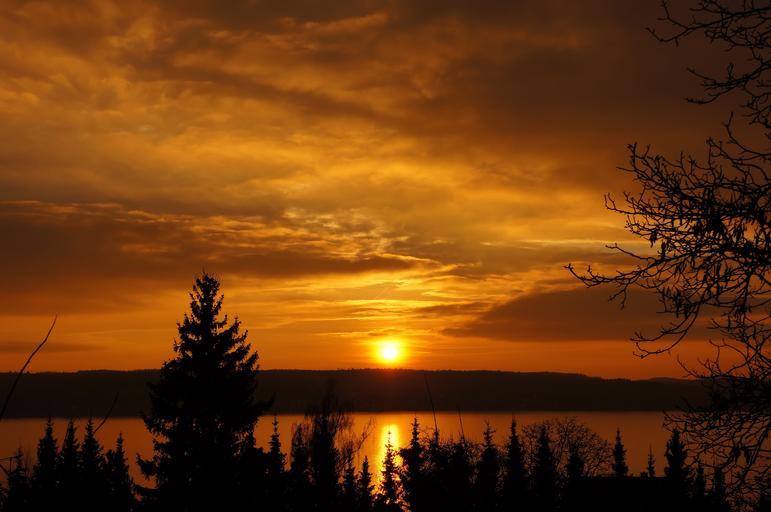 Keywords: sunset orange sun sunny cloud branches winter lake reflection nature water pine plant trees tree lake constance
