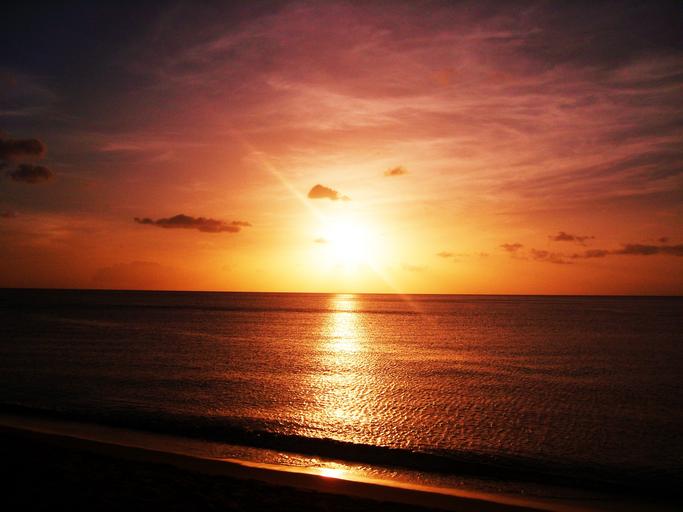 Keywords: sunset sea ocean clouds sun sunset on the sea evening violet red orange yellow beach sun's rays reflections on the water horizon twilight landscape blazing sky sunlight guadeloupe
