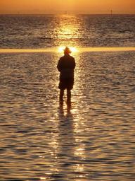Keywords: sunset seascape ocean water silhouette man person landscape evening dusk twilight reflection light sun waves sea mysterious looking