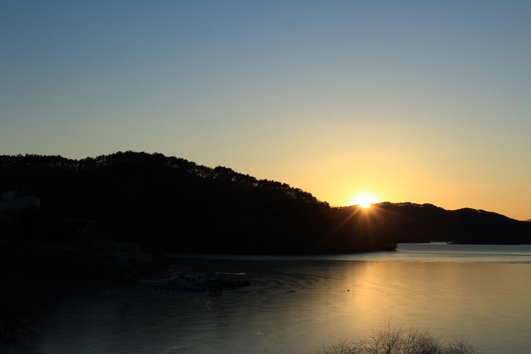 Keywords: sunset sun beams glow lake reflection mountains silhouette winter