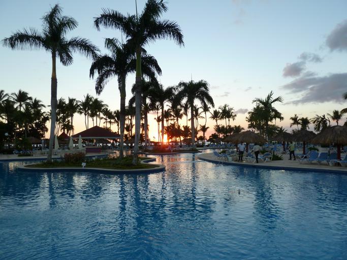 Keywords: sunset swimming pool palm trees holiday tourism pool water vacation beach resort dominican