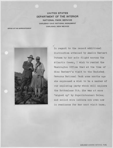 | Keywords: nara:arcid=293450 national archives nationalarchives amelia earhart ameliaearhart department of the interior departmentoftheinterior carlsbad caverns national park carlsbadcavernsnationalpark national park nationalpark superintendent boles superintendentboles 1932 blackandwhite monochrome text black and white Original Caption: This report includes a photograph of Superintendent Boles with Amelia Earhart Putnam who visited Carlsbad Caverns. From:: Series: Correspondence and Other Records Relating to National Parks, Monuments, and Recreational Areas, compiled 1927 - 1953 Created By:: Department of the Interior. National Park Service. Region III. Carlsbad Caverns National Park. (08/07/1937 - 06/1962) Production Date: 06/1932 - 06/1932 Persistent URL: arcweb.archives.gov/arc/action/ExternalIdSearch?id=293450 Repository: NARA's Rocky Mountain Region (Denver) For information about ordering reproductions of photographs held by the Still Picture Unit, visit: www.archives.gov/research/order/still-pictures.html Reproductions may be ordered via an independent vendor. NARA maintains a list of vendors at www.archives.gov/research/order/vendors-photos-maps-dc.html Access Restrictions: Unrestricted Use Restrictions: Unrestricted Original Caption: This report includes a photograph of Superintendent Boles with Amelia Earhart Putnam who visited Carlsbad Caverns. From:: Series: Correspondence and Other Records Relating to National Parks, Monuments, and Recreational Areas, compiled 1927 - 1953 Created By:: Department of the Interior. National Park Service. Region III. Carlsbad Caverns National Park. (08/07/1937 - 06/1962) Production Date: 06/1932 - 06/1932 Persistent URL: arcweb.archives.gov/arc/action/ExternalIdSearch?id=293450 Repository: NARA's Rocky Mountain Region (Denver) For information about ordering reproductions of photographs held by the Still Picture Unit, visit: www.archives.gov/research/order/still-pictures.html Reproductions may be ordered via an independent vendor. NARA maintains a list of vendors at www.archives.gov/research/order/vendors-photos-maps-dc.html Access Restrictions: Unrestricted Use Restrictions: Unrestricted |