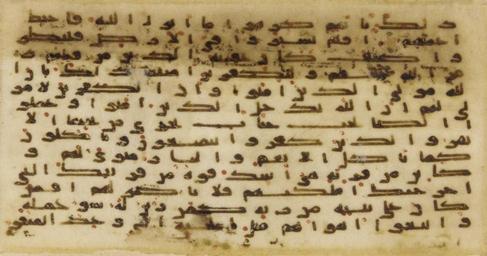 Keywords: Surat 47 Muhammad ayah 9-15 folio.jpg Folio from a Koran Sura 47 verses 9-15 Ink and opaque watercolor on parchment H 4 8 W 8 4 cm Probably Northern Africa Purchase S1997 42 Smithsonian Freer/Sackler http //www asia si edu/collections/singleObject cfm ObjectId 25045 page http //www asia si edu/collections/zoomObject cfm ObjectId 25045 zoom century 9 Uknown Copyright lapsed PD-Art Qur'an manuscripts 9th century