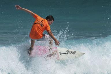 Keywords: surfer surfboard surfing wave water surf ocean hawaii young board fun spray foam balance