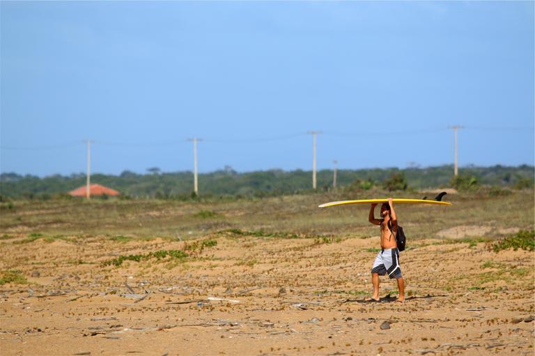 Keywords: surfer surfboard young guy man backpack swim trunks bathing suit beach sand