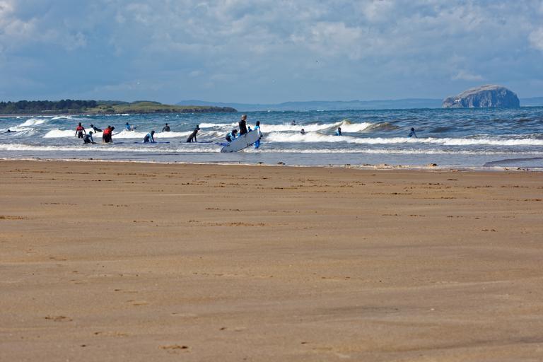 Keywords: surfers surfing surf school waves beach sand shoreline surfboards kids adults people bass rock firth of forth scotland women scottish female surf