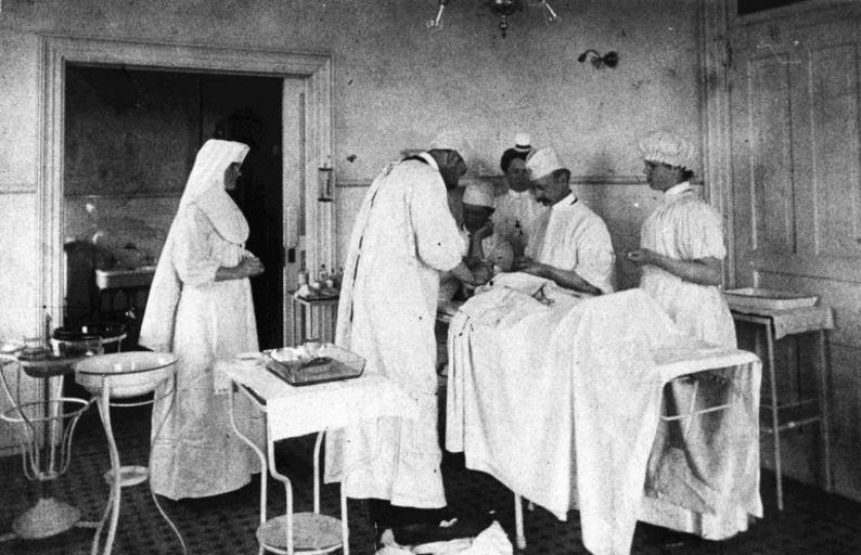 | Keywords: nurses doctors surgery hospitals st. joseph's hospital stjosephshospital operation room health care healthcare port arthur portarthur thunder bay thunderbay nursing operating room operatingroom scrubs ontario canada history blackandwhite monochrome black and white Date: 1906 Description: This photograph shows the operating room at St. Joseph's Hospital in 1906. An unknown surgery is taking place. From left to right: Sister Lagourie, E. Regan, Dr. McGrady, Dr. Brown, Dr. Pratt, and Miss N. York (a student nurse). Accession No.: 984.1.96 Date: 1906 Description: This photograph shows the operating room at St. Joseph's Hospital in 1906. An unknown surgery is taking place. From left to right: Sister Lagourie, E. Regan, Dr. McGrady, Dr. Brown, Dr. Pratt, and Miss N. York (a student nurse). Accession No.: 984.1.96 |