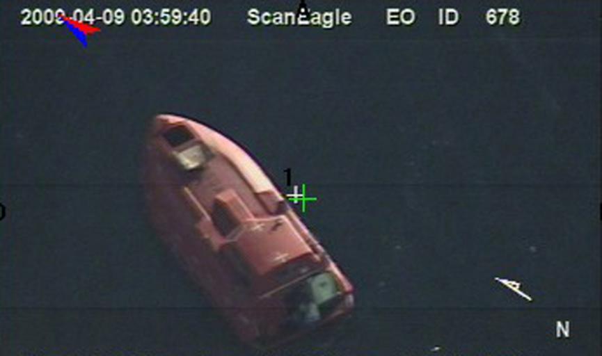 | Keywords: Surveillance photo of Maersk Alabama lifeboat, hijacked by pirates 090409-N-0000X-926.jpg 090409-N-0000X-926 INDIAN OCEAN April 9 2009 In a still frame from video taken by the Scan Eagle unmanned aerial vehicle a 28-foot lifeboat from the U S -flagged container ship Maersk Alabama is seen in the Indian Ocean U S Navy Photo http //www navy mil/view_image asp id 70450 Navy News Servicehttp //www navy mil/management/photodb/photos/090409-N-0000X-926 jpg Hi-Res Version 2009-04-09 US Navy Scan Eagle UAV PD-USGov-Military-Navy USS Bainbridge DDG-96 Maersk Alabama lifeboat Boeing ScanEagle Still images from videos Photos and video from unmanned aerial vehicles |