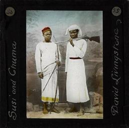 Keywords: Susi and Chuma, Africa, ca.1870-ca.1900 (imp-cswc-GB-237-CSWC47-LS16-055).jpg en <br> Susi and Chuma Africa ca 1870-ca 1900 Photograph of two loyal servants of David Livingstone Susi and Chuma both freed from slavery by Livingstone One man is pictured carrying a bow and arrow the other a rifle Following the death of Livingstone Susi and Chuma carried his body all the way to Bagamoyo on the coast of modern day Tanzania From there it was handed over to the British authorities and transported to London for burial ; This belongs to a series of Church of Scotland Foreign Missions Committee lantern slides relating to David Livingstone 1813-1873 the Scottish missionary who was best known as an explorer of Africa and anti-slavery campaigner Livingstone was born in Blantyre Scotland and after working in the local cotton mill from the age of 10 he went on to study medicine and theology in Glasgow in 1836 Having decided to become a missionary he was posted to southern Africa in 1841 In 1845 he married Mary Moffat During his life Livingstone carried out exploration of southern eastern and central Africa he discovered and named the Victoria Falls and it was his meeting with H M Stanley during a search for the source of the Nile that gave rise to the popular quotation Dr Livingstone I presume David Livingstone died in Africa on 1 May 1873 and his body was buried in Westminster Abbey Photographer Unknown Subject personal name Livingstone David 1813-1873 Filename imp-cswc-GB-237-CSWC47-LS16-055 tif Coverage date after 1873 Part of collection International Mission Photography Archive ca 1860-ca 1960 Type images Part of subcollection Photographs from the Centre for the Study of World Christianity University of Edinburgh U K ca 1900-ca 1940s Repository name Centre for the Study of World Christianity Archival file impaunpub_Volume7/1888 url Repository address The University of Edinburgh School of Divinity New College Mound Place Edinburgh EH1 2LX United Kingdom Geographic subject country Zambia Format aacr2 1 lantern slide 8 x 8 cm Geographic subject continent Africa Rights Contact the repository for details Part of series David Livingstone LS16 Repository email divinity-CSWC ed ac uk Subject lcsh Keyword Explorers; Missionaries Date created circa 1875/1940 Publisher of the digital version University of Southern California Libraries Subject aat genre interior views Format aat lantern slides Legacy record ID impa-m69471 Access conditions http //www ed ac uk/schools-departments/divinity/research/centres/world-christianity/collections-resources File GB 237 CSWC47/LS16/55 circa 1875 /1940 author http //digitallibrary usc edu/cdm/ref/collection/p15799coll123/id/65004 PD-old-70-1923 Magic lantern images Images from USC Digital Library uploaded by Fæ International Mission Photography Archive ca 1860-ca 1960 David Livingstone IMPA |