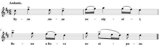 | Keywords: Кант Юрию.svg uk Ілюст ація до статті иколи Лисенка а одні музичні ст ументи на Вк аїнї оти на одного Канта Ю ию 1894-04-27 Зо я часопис 1894 08 с 185-187 а одні; записано иколою Лисенком other versions Часопис Зо я 1894 08 pdf Hidden background ECECEC; white;color black border 1px grey solid; padding 2px Created by MuseScore <nowiki> < xml version 1 0 encoding UTF-8 > <museScore version 2 06 > <programVersion>2 0 2</programVersion> <programRevision>f51dc11</programRevision> <Score> <LayerTag id 0 tag default ></LayerTag> <currentLayer>0</currentLayer> <Synthesizer> </Synthesizer> <Division>480</Division> <Style> <lastSystemFillLimit>0</lastSystemFillLimit> <TextStyle> <halign>center</halign> <valign>baseline</valign> <xoffset>0</xoffset> <yoffset>6</yoffset> <offsetType>spatium</offsetType> <name>Lyrics Odd Lines</name> <family>FreeSerif</family> <size>11</size> <bold>1</bold> <sizeIsSpatiumDependent>1</sizeIsSpatiumDependent> </TextStyle> <page-layout> <page-height>374 173</page-height> <page-width>1190 55</page-width> <page-margins type even > <left-margin>5 66929</left-margin> <right-margin>5 66929</right-margin> <top-margin>56 6929</top-margin> <bottom-margin>113 386</bottom-margin> </page-margins> <page-margins type odd > <left-margin>5 66929</left-margin> <right-margin>5 66929</right-margin> <top-margin>0</top-margin> <bottom-margin>0</bottom-margin> </page-margins> </page-layout> <Spatium>1 764</Spatium> </Style> <showInvisible>1</showInvisible> <showUnprintable>1</showUnprintable> <showFrames>1</showFrames> <showMargins>0</showMargins> <metaTag name arranger ></metaTag> <metaTag name composer ></metaTag> <metaTag name copyright ></metaTag> <metaTag name creationDate >2015-11-28</metaTag> <metaTag name lyricist ></metaTag> <metaTag name movementNumber ></metaTag> <metaTag name movementTitle ></metaTag> <metaTag name platform >Microsoft Windows</metaTag> <metaTag name poet ></metaTag> <metaTag name source ></metaTag> <metaTag name translator ></metaTag> <metaTag name workNumber ></metaTag> <metaTag name workTitle ></metaTag> <PageList> <Page> <System> </System> <System> </System> </Page> </PageList> <Part> <Staff id 1 > <StaffType group pitched > <name>stdNormal</name> </StaffType> </Staff> <trackName>Violin</trackName> <Instrument> <longName>Violin</longName> <shortName>Vln </shortName> <trackName>Violin</trackName> <minPitchP>55</minPitchP> <maxPitchP>103</maxPitchP> <minPitchA>55</minPitchA> <maxPitchA>88</maxPitchA> <instrumentId>strings violin</instrumentId> <Articulation> <velocity>100</velocity> <gateTime>100</gateTime> </Articulation> <Articulation name staccatissimo > <velocity>100</velocity> <gateTime>33</gateTime> </Articulation> <Articulation name staccato > <velocity>100</velocity> <gateTime>50</gateTime> </Articulation> <Articulation name portato > <velocity>100</velocity> <gateTime>67</gateTime> </Articulation> <Articulation name tenuto > <velocity>100</velocity> <gateTime>100</gateTime> </Articulation> <Articulation name marcato > <velocity>120</velocity> <gateTime>67</gateTime> </Articulation> <Articulation name sforzato > <velocity>120</velocity> <gateTime>100</gateTime> </Articulation> <Channel> <program value 40 /> <synti>Fluid</synti> </Channel> <Channel name pizzicato > <program value 45 /> <synti>Fluid</synti> </Channel> <Channel name tremolo > <program value 44 /> <synti>Fluid</synti> </Channel> </Instrument> </Part> <Staff id 1 > <Measure number 1 > <KeySig> <accidental>2</accidental> </KeySig> <TimeSig> <sigN>6</sigN> <sigD>8</sigD> <showCourtesySig>1</showCourtesySig> </TimeSig> <Tempo> <tempo>1 16667</tempo> <text>Andante </text> </Tempo> <Chord> <durationType>eighth</durationType> <Lyrics> <syllabic>begin</syllabic> <text>Бу</text> </Lyrics> <Note> <pitch>74</pitch> <tpc>16</tpc> </Note> </Chord> <Chord> <durationType>quarter</durationType> <Articulation> <subtype>sforzato</subtype> </Articulation> <Lyrics> <syllabic>end</syllabic> <text>ли</text> </Lyrics> <Note> <pitch>78</pitch> <tpc>20</tpc> </Note> </Chord> <Chord> <durationType>eighth</durationType> <Lyrics> <syllabic>begin</syllabic> <text>лю</text> </Lyrics> <Note> <pitch>76</pitch> <tpc>18</tpc> </Note> </Chord> <Chord> <durationType>quarter</durationType> <Articulation> <subtype>sforzato</subtype> </Articulation> <Lyrics> <syllabic>end</syllabic> <text>ди</text> </Lyrics> <Note> <pitch>74</pitch> <tpc>16</tpc> </Note> </Chord> </Measure> <Measure number 2 > <LayoutBreak> <subtype>line</subtype> </LayoutBreak> <Slur id 2 > <track>0</track> </Slur> <Chord> <durationType>16th</durationType> <Lyrics> <syllabic>begin</syllabic> <text>не</text> </Lyrics> <Slur type start id 2 /> <Note> <pitch>78</pitch> <tpc>20</tpc> </Note> </Chord> <Chord> <durationType>16th</durationType> <Slur type stop id 2 /> <Note> <pitch>79</pitch> <tpc>15</tpc> </Note> </Chord> <Chord> <durationType>quarter</durationType> <Lyrics> <syllabic>middle</syllabic> <text>ві </text> </Lyrics> <Note> <pitch>81</pitch> <tpc>17</tpc> </Note> </Chord> <Slur id 3 > <track>0</track> </Slur> <Chord> <durationType>16th</durationType> <Lyrics> <syllabic>middle</syllabic> <text>нї</text> </Lyrics> <Slur type start id 3 /> <Note> <pitch>79</pitch> <tpc>15</tpc> </Note> </Chord> <Chord> <durationType>16th</durationType> <Slur type stop id 3 /> <Note> <pitch>78</pitch> <tpc>20</tpc> </Note> </Chord> <Chord> <durationType>quarter</durationType> <Lyrics> <syllabic>end</syllabic> <text>ї </text> </Lyrics> <Note> <pitch>76</pitch> <tpc>18</tpc> </Note> </Chord> </Measure> <Measure number 3 > <Chord> <durationType>quarter</durationType> <Articulation> <subtype>sforzato</subtype> </Articulation> <Lyrics> <syllabic>begin</syllabic> <text>Во</text> </Lyrics> <Note> <pitch>81</pitch> <tpc>17</tpc> </Note> </Chord> <Chord> <durationType>eighth</durationType> <Lyrics> <syllabic>end</syllabic> <te